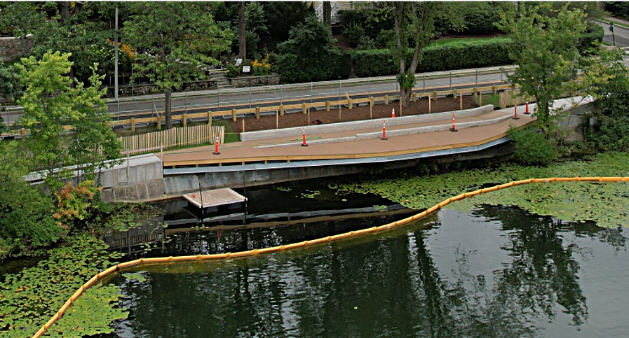 Eight truckloads of concrete have been poured to create 200 feet of new walkways, erosion-proof walls, and a framework for the wooden pier. The 150 feet of new railings, along the freshly paved walkways, will bring the area into ADA compliance and make it accessible for everyone for the first time.