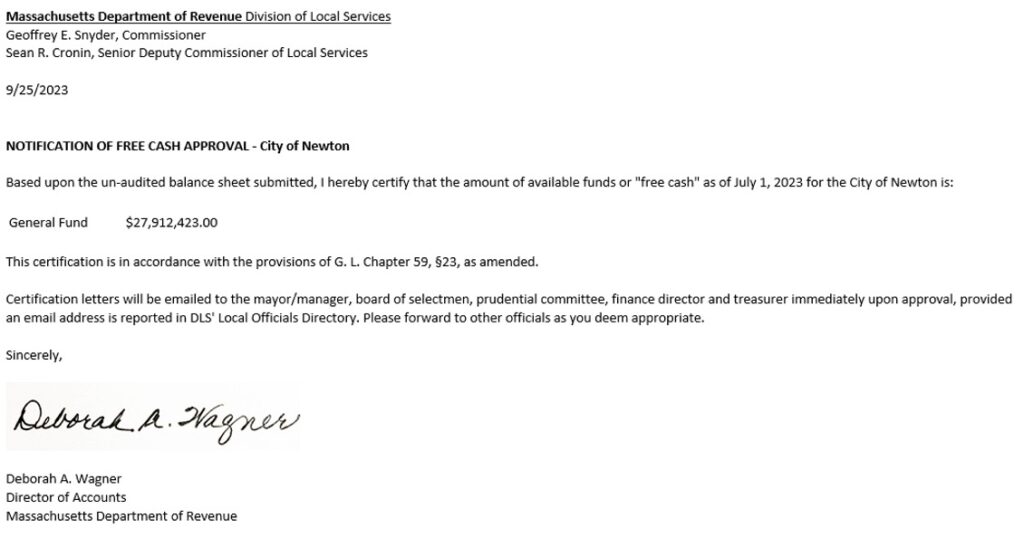 Newton’s Comptroller, Stephen Curley, has reported that on September 25 the Massachusetts Department of Revenue certified the amount of the City of Newton’s Free Cash — the amount of unrestricted funds available from operations in the previous year – to be $27,912,423. In late August, Mayor Ruthanne Fuller had announced that the…