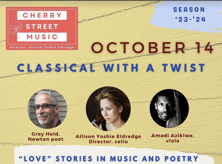 Cherry Street Players will start the 2023-24 Classical with a Twist season on October 14 at 7:30PM at the Allen Center (35 Webster Street, West Newton) with “LOVE” an evening of poetry and music. Tickets are $30 ($10 students).