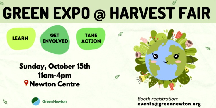 The 2023 GreenEXPO will be held on Sunday, October 15, 11AM-4PM on the Newton Centre Green in conjunction with the City of Newton’s Harvest Fair.