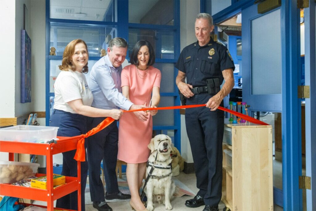 Joining Chief John Carmichael and members of the Newton Police Department to open the Bright Space was Newton Mayor Ruthanne Fuller, Bright Horizons CEO Stephen Kramer, Chief Operating Officer Mary Lou Burke Afonso, and Bright Horizons Foundation President Yvonne Lynch.