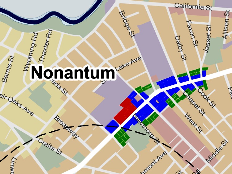 On Monday, September 11, the City Council Zoning and Planning Committee took a straw vote approving Version 3.0 of the proposed Village Center Overlay District Zoning Map. On it, Nonantum’s village center is zoned for 3.5 story development on the south side of Watertown Street and up to six stories on the North side from Nevada Street to just before Adams Street. Ward 1 Councilor At-Large John Oliver voted against this new version, calling it “punitive.”