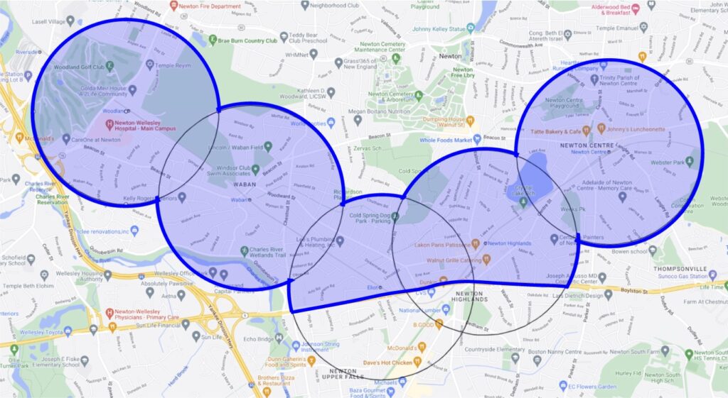 I propose one specific area in Newton for MRT zoning: the area in the five overlapping half-mile circles around MBTA stations at Newton Centre, Newton Highlands, Eliot, Waban, and Woodland that overlays the current zones SR2, SR3, MR1, MR2, and MR3. Only the area that lies north of Route 9 is included because it is difficult for pedestrians to cross Route 9.