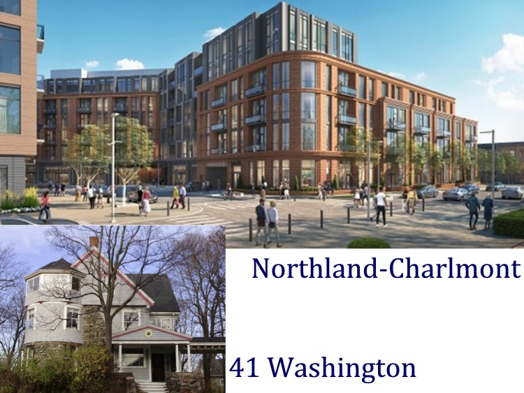 Northland-Charlemont: The revised proposal decreased the total number of units from 410 to 370 and reduced the number of affordable units from 103 to 93. There will be two connector driveways from Charlemont to Christina Street, with the western one providing access to the development’s underground parking and loading areas. The site plan now includes a traffic roundabout partially located on the site’s northeastern corner to accommodate routing for the proposed public passenger shuttle. The affordability thresholds have been changed: 20% of the affordable units moved from 80% of the area median income (AMI) to 50% of AMI, resulting in 19 units being offered at 50% of AMI and the remaining 74 units at 80% of AMI.