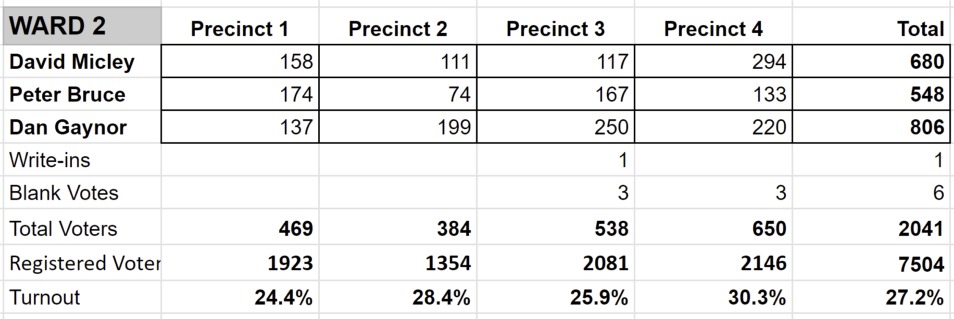 Official results, now certified by the Election Commission, indicate that Dan Gaynor (806 votes) and David Micley (680 votes) succeeded in the September 12 Preliminary Election and will advance to compete in the November 7 municipal election for Ward Councilor for Ward 2. This Preliminary Election ends the run for the third candidate, Peter Bruce (548 votes).