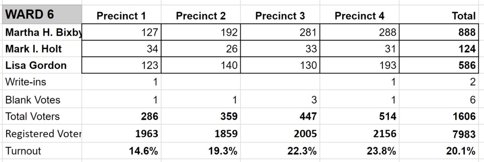 Official results, now certified by the Election Commission, indicate that Martha Bixby (888 votes) and Lisa Gordon (586 votes) succeeded in the September 12 Preliminary Election and will advance to compete in the November 7 municipal election for Ward Councilor for Ward 6. This Preliminary Election ends the run for the third candidate, Mark Holt (124 votes).