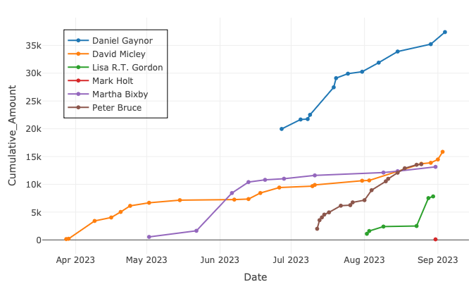 Gaynor opened his fundraising reporting to OCPF with a total of $19,967 in contributions reported made on June 27. Micley raised roughly half of his funds by May 1, while Bixby surged in early June. Gordon and Bruce got later starts but have climbed in recent weeks.
