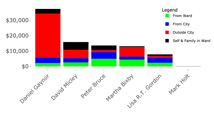 This analysis reports separately the total funding from the candidates and their immediate family members residing in their ward. Dan Gaynor did not donate or loan funds to his campaign but received $3,000 from his spouse and parents on Cabot Street. David Micley loaned $3,000 to his campaign, donated $1050, and received a $1000 donation from his mother. Peter Bruce loaned $2,000 to his campaign and received $1,000 from his spouse. Martha Bixby and Mark Holt donated $540 and $100 respectively to their campaigns. Lisa Gordon received $1,000 from her mother.