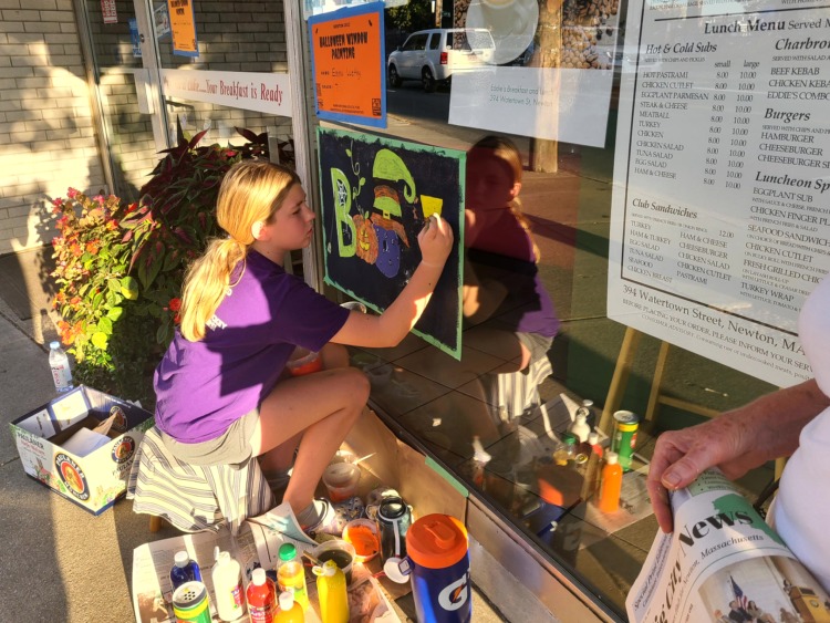 On Saturday, October 28, hundreds of Newton’s student painters gathered to decorate windows at business storefronts in six villages and also the Newton Free Library, painting Halloween-themed images for Newton’s 24th annual Halloween Window Painting event. Browse the photos taken by John and Amy Sangiolo in each of the locations: