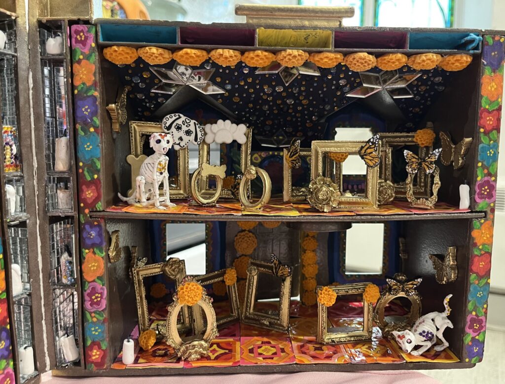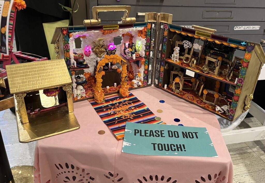 Wolcott made her incredibly detailed “Little People House Shrine,” using clay, wax, wood and paper, among other objects. The diminutive piece was on display next to a much larger, equally intricate ofrenda she helped design for New Art Center’s (NAC) Dia de los Muertos event on Sunday, which