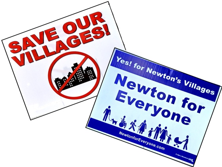 Two different signs have become visible across Newton, representing two points of view about the City’s proposed rezoning plan.
