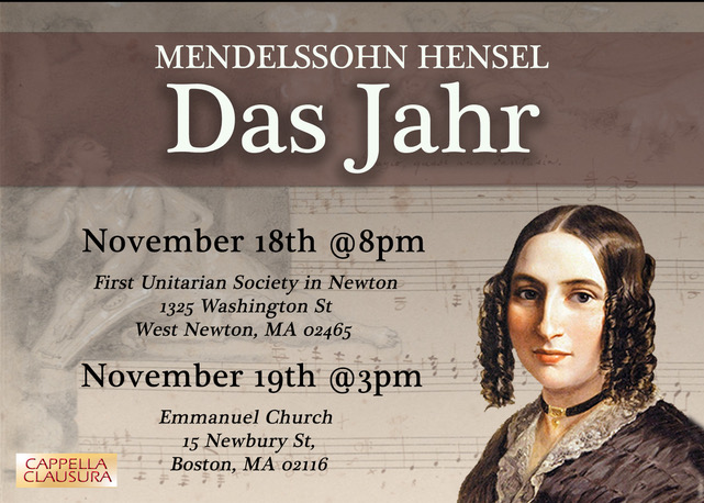 The classical vocal group Cappella Clausura premieres music by women — this time Das Jahr (The Year), by Fanny Mendelssohn Hensel, sister of her more famous brother Felix. According to Amelia LeClair, Director of Cappella Clausura, Fanny Mendelsohn wrote a lot of music, “but her loving younger brother, despite his counting on her help with his own works, would not allow her to publish.”