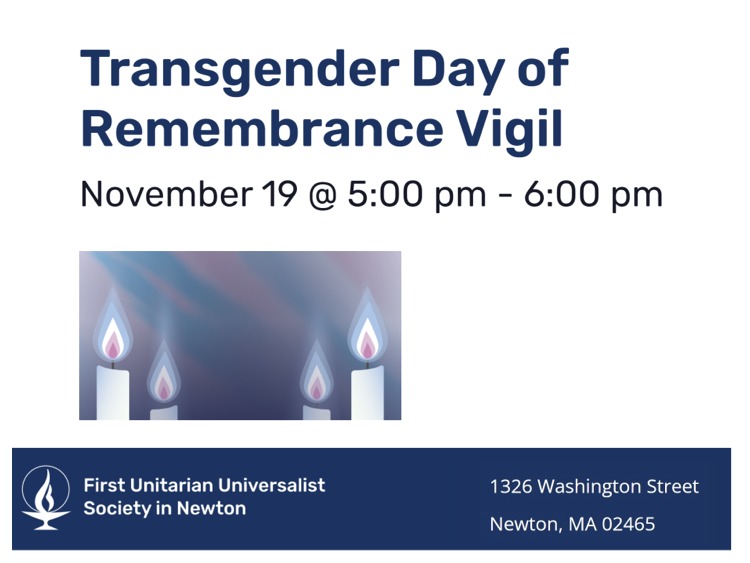 The First Unitarian Universalist Society in Newton invites people of all faiths and identities to its annual vigil in memory of all those around the world whose lives were lost to violence due to their transgender identity. The ritual includes a litany of the names of those who were lost, music, prayers and candlelight. November 19, 5PM-6PM at FUUSN (1326 Washington Street, West Newton).