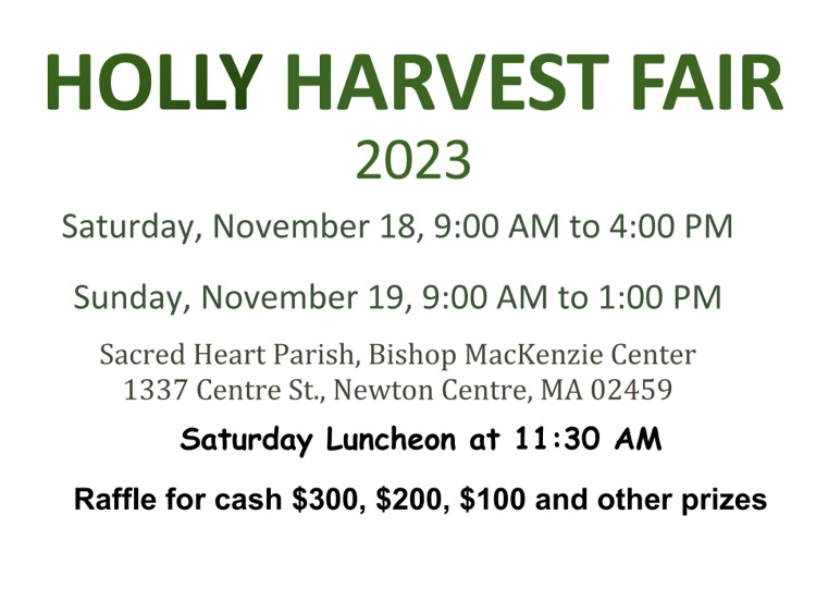 The Guild of St. Francis, Parishes of Sacred Heart and Our Lady’s, Newton Centre-West Newton/Nahanton will present its Holly Harvest Fair in the parking lot of the Bishop MacKenzie Center (1337 Centre Street, Newton Centre) on November 18 (9AM-4PM) and November 19 (9AM-1PM). Some features: Luncheon on Saturday at 11:30AM, a Raffle for cash and other prizes, Holiday Table, Toy Shops, Silent Auction, Plants, Knits, Gifts, Gift Baskets, Baked Goods, Frozen Holiday Pies, Children’s Activities, and more! For more information call 617-969-2248.