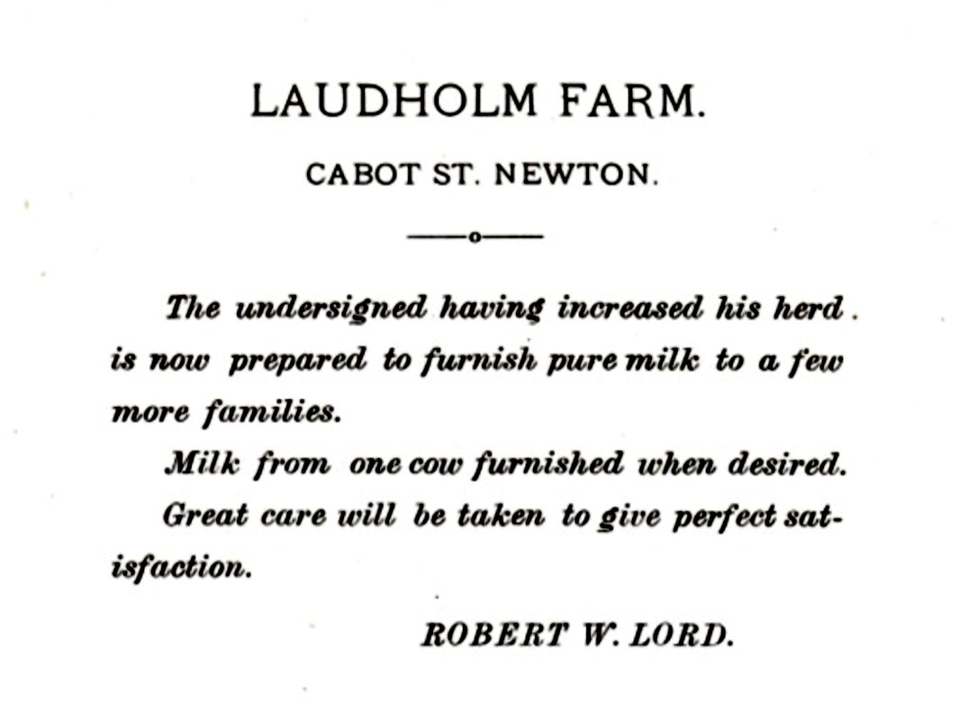 Farming, including dairy farming, survived on the north side of Newton well into the late 19th and early 20th centuries. Years ago, I especially enjoyed a circa 1885 ad for Laudholm Farm on Cabot Street, displayed in a Historic Newton exhibit organized by Susan Abele. The ad says “Milk from one cow furnished when desired.” That’s really knowing where your food comes from!