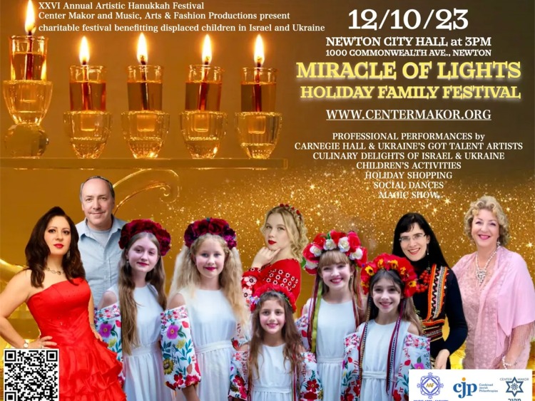 Miracle of Lights: a Holiday Family Festival — will take place at Newton City Hall on December 10, 3PM-5PM. Doors will open at 2:30PM. It’s a charitable festival celebrating Hanukkah and benefiting displaced children in Israel and Ukraine. It’s sponsored by Center Makor and Music, Arts & Fashion Productions. Tickets are $40 ($50 at the door); $20 ($25 at the door) for students and seniors; and free for children 13 and under.