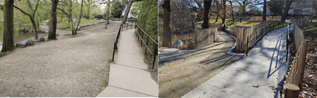 Srdjan Nedeljkovic, secretary of the Newton Highlands Neighborhood Area Council, said he is pleased with access to the fishing deck, better pedestrian circulation throughout the park, and the environmental measures. He too expressed concern about the placement of the boulders and the rocks. “Hopefully, the City will assess the use of the new park and will be responsive to further improving accessibility to the water,” he said.