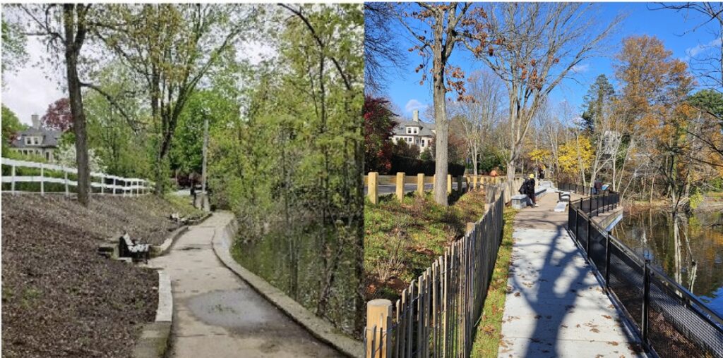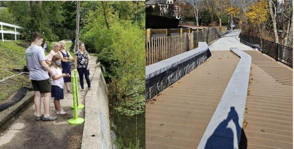 Highlighting new design aspects, the Mayor noted the “ingenious [and] hidden,” erosion-control walls that double as seating areas. The project cost $1.6 million, of which $1.4 million was from Community Preservation Act funds.
