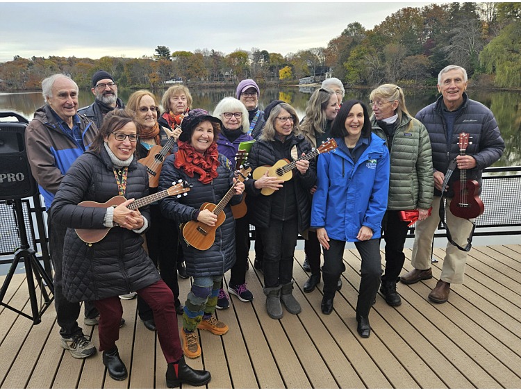 Heralding the ribbon-cutting event, the City Hall Strummers — about a dozen local ukulele players led by Newton’s Director of Cultural Development, Paula Gannon — played and sang, inviting the crowd to join in.