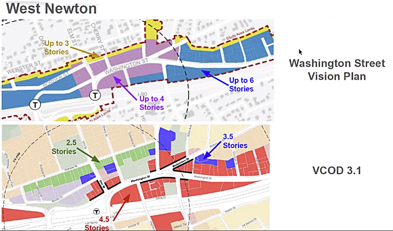 • Councilor Lucas proposed reducing the zoning for lots on Walnut Street and Austin Street in Newtonville from VC3 to VC2. He argued that the building heights and density should not be the same as on Washington Street and that the Washington Street Vision Plan had a maximum height between 1- 4 stories, in contrast to the proposed VC3, which allows up to 5 stories. He urged the Council to uphold what he believes was a “promise” made to the community, when the Council voted to adopt the Washington Street Vision Plan as part of the City’s Comprehensive Plan. He added that Newtonville residents were recently informed about a 300-unit 40B project. His proposal would be a reduction of approximately 40 units from the MBTA Compliance number. The Planning Department said it did not do an economic feasibility analysis for VC2 requiring ground floor development. Councilors Crossley, Bowman, and Leary argued the need to allow for more density — particularly if requiring first-floor retail. Wright countered that the City can revisit the zoning, but if they rezone it now, they will “open the floodgates.” Several question arose from this discussion: