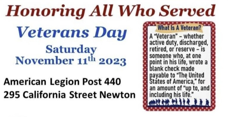 American Legion Post 440 (295 California Street, Nonantum) will observe Veterans Day on Saturday, November 11 with these events: