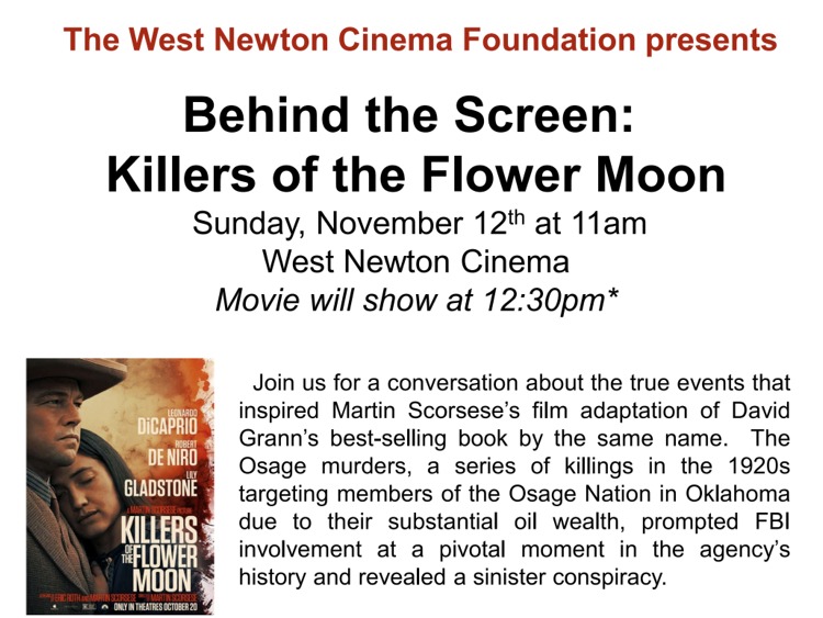 The West Newton Cinema Foundation — founded last year to transition the cinema to nonprofit management — will present a free panel discussion: Behind the Screen: Killers of the Flower Moon at the cinema on November 12, 11AM-12:15PM. Register here.
