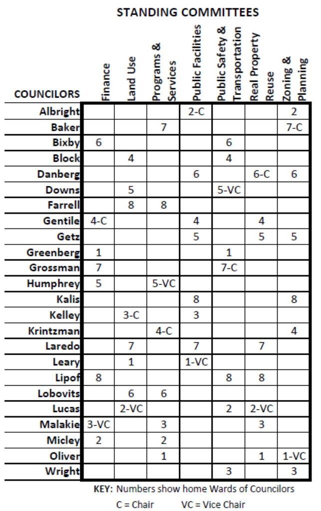 - Land Use: Kelley (Chair), Lucas (Vice Chair), Block, Downs, Farrell, Laredo, Leary, Lobovits