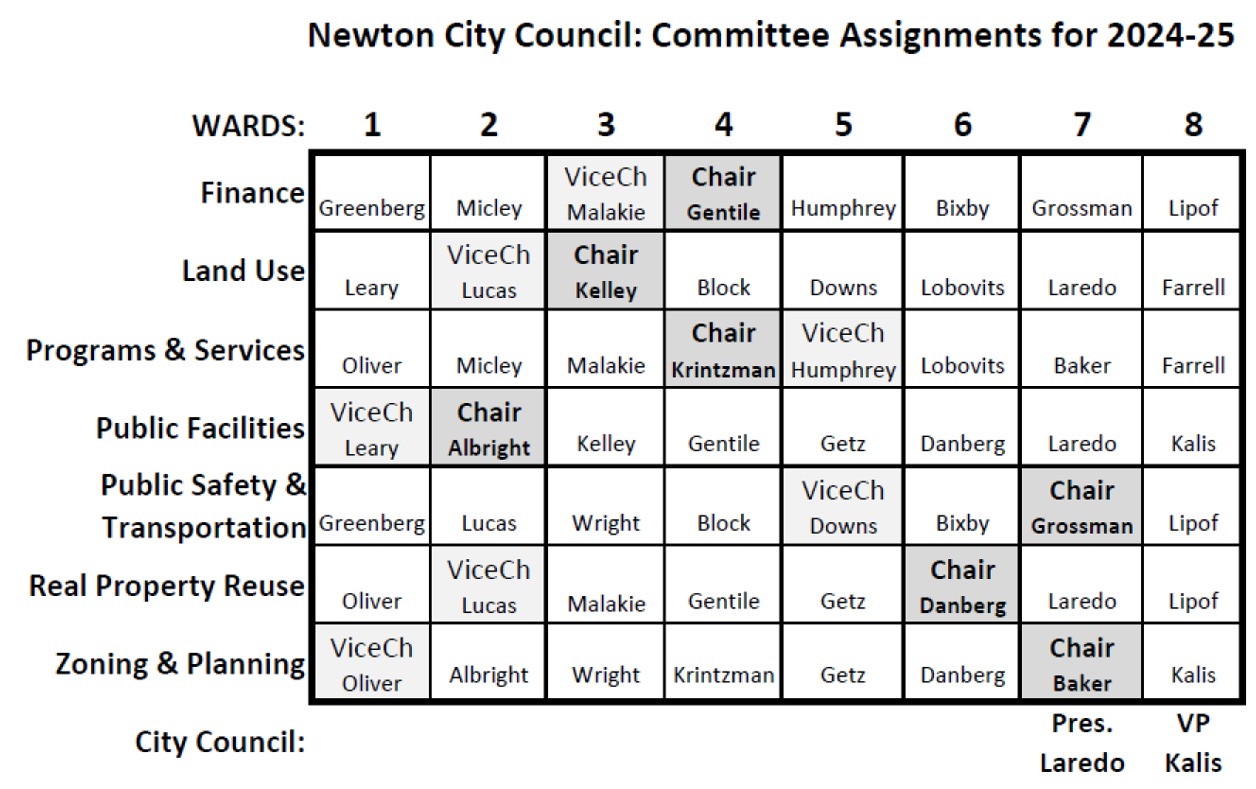 On December 19, President-Elect Marc Laredo and Vice President-Elect David Kalis announced their assignments of City Councilors to the Council’s seven standing committees for the 2024-25 term. The incoming Council leaders emphasized that in making these assignments, they “paid careful attention to making sure that leadership roles are distributed fairly and Committees represent a diversity of views.” Each committee is assigned one Councilor from each ward.