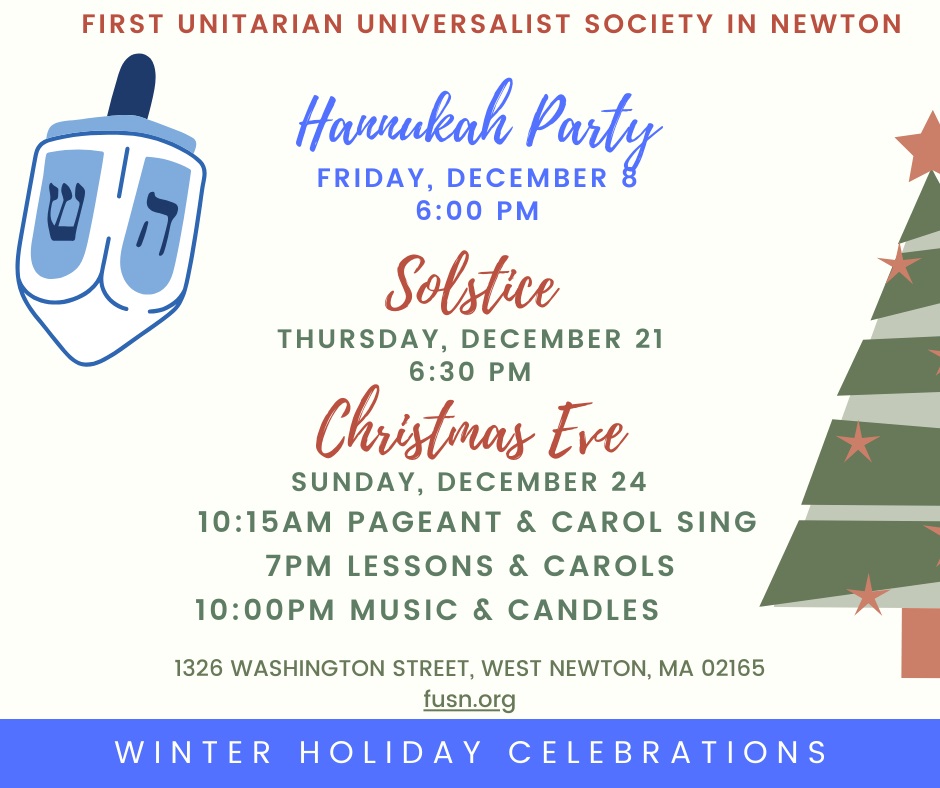 The following Holiday Services will be held at the First Unitarian Universalist Society in Newton (1326 Washington Street, West Newton):