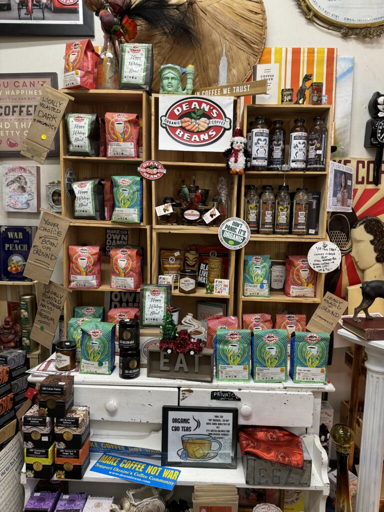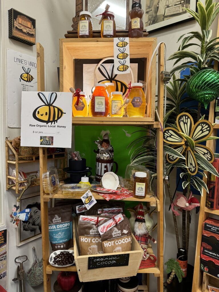 For instance, Lynne’s Vintique offers Dean’s Beans coffee. The company, founded by Dean Cycon, a former environmental and Indigenous rights lawyer, creates partnerships with small farm cooperatives from around the world and offers fair trade, organic, direct farm-to-roaster, shade-grown, bird friendly coffee. Lynne also offers honey and fruit preserves from local farmer and beekeeper, Peter Hauschka, and hand carvings from Vincent Nigro, a retired construction worker, furniture restorer, and local artist.