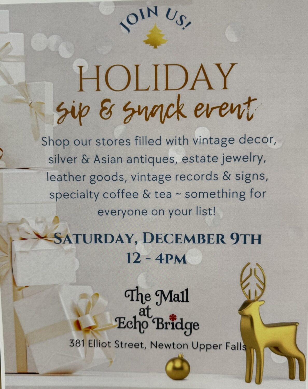 Tucked away, in a former mill site off Chestnut Street in Newton Upper Falls, is the Mall at Echo Bridge — a small community of local businesses offering an eclectic mix of goods and services. On Saturday, December 9, the Mall will host a Holiday Sip and Snack event, 12PM – 4PM. The Mall is located at 381 Elliot Street, in the historic village of Newton Upper Falls.