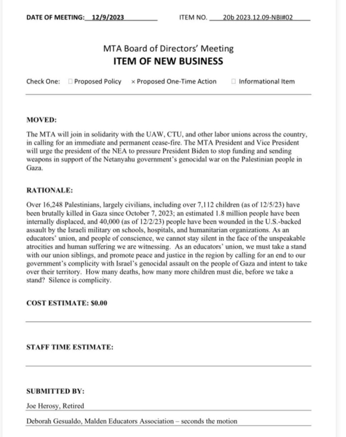 On December 9, the board of the Massachusetts Teachers Association (MTA) approved a motion “calling for an immediate and permanent cease-fire … in the genocidal war on the Palestinian people in Gaza.”