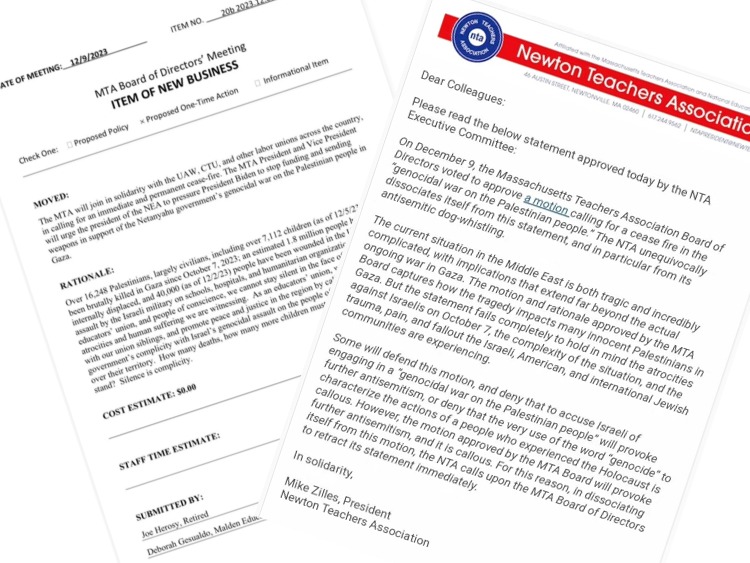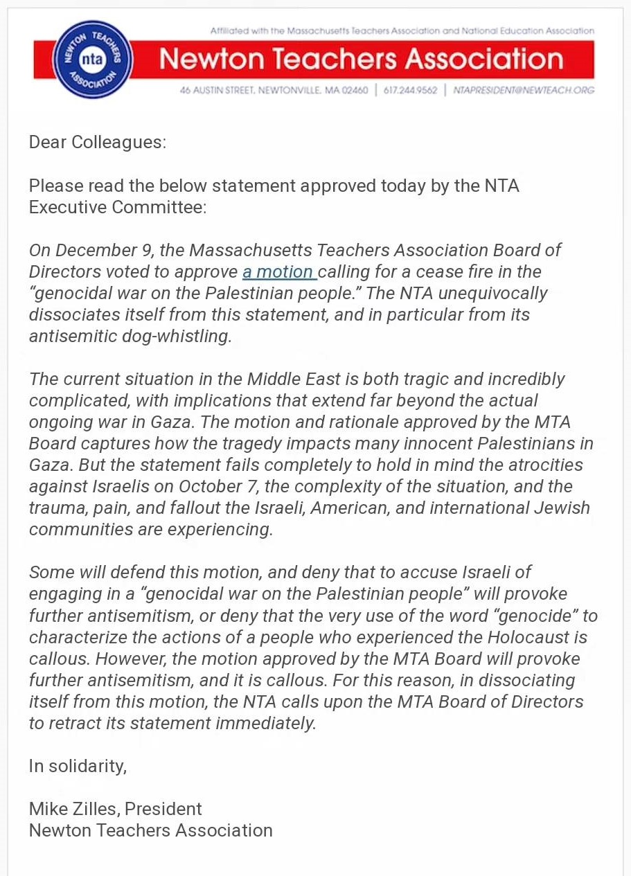 On December 12, the Newton Teachers Association (NTA) issued a statement in response, saying in part: “The NTA unequivocally dissociates itself from [the MTA’s] statement, and in particular from its antisemitic dog-whistling. The current situation in the Middle East is both tragic and incredibly complicated, with implications that extend far beyond the actual ongoing war in Gaza. …[T]he motion approved by the MTA Board will provoke further antisemitism, and it is callous.”