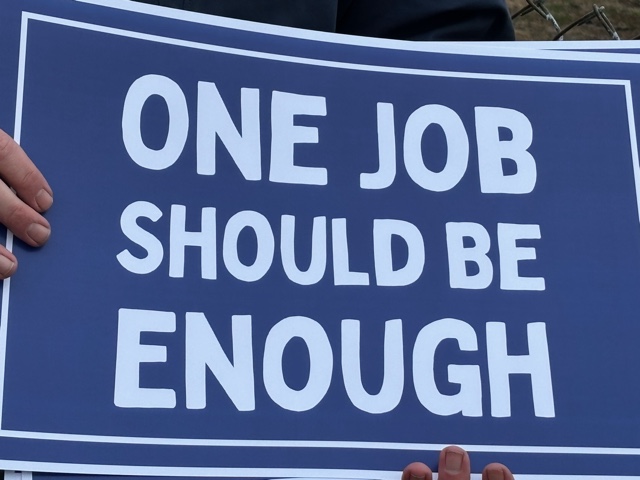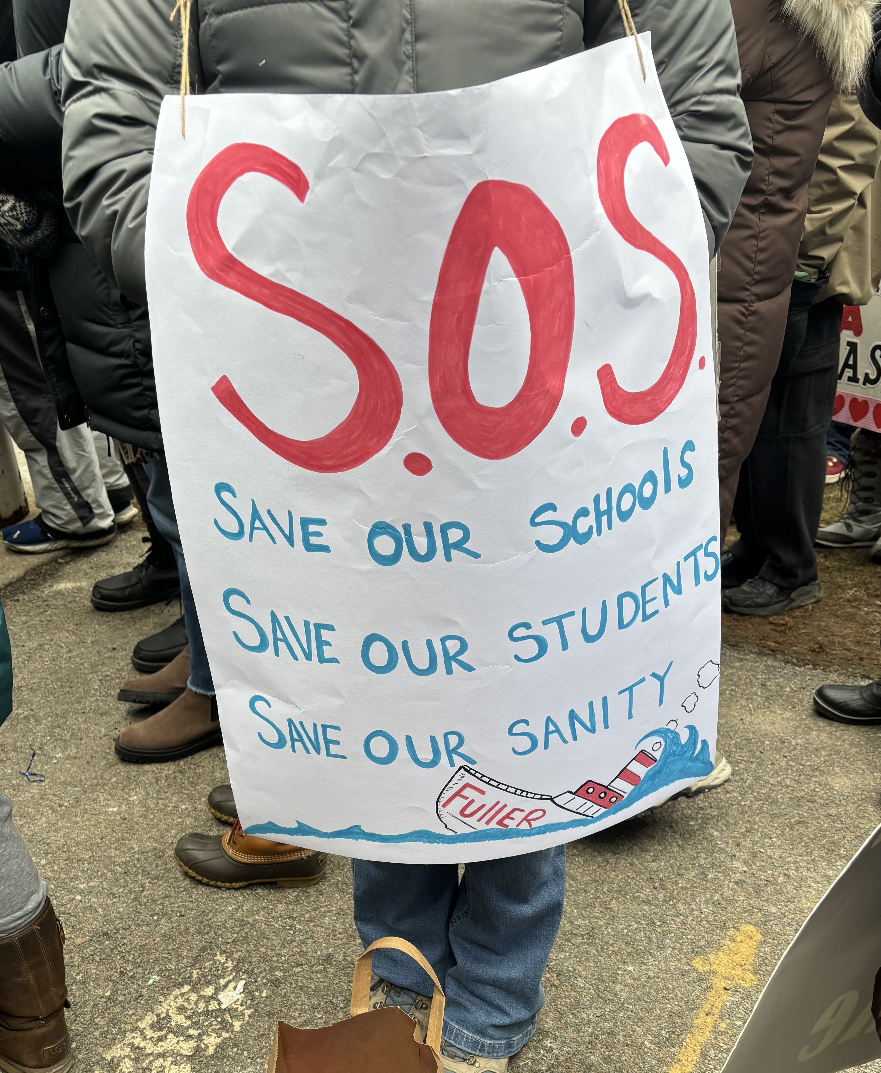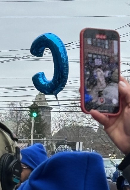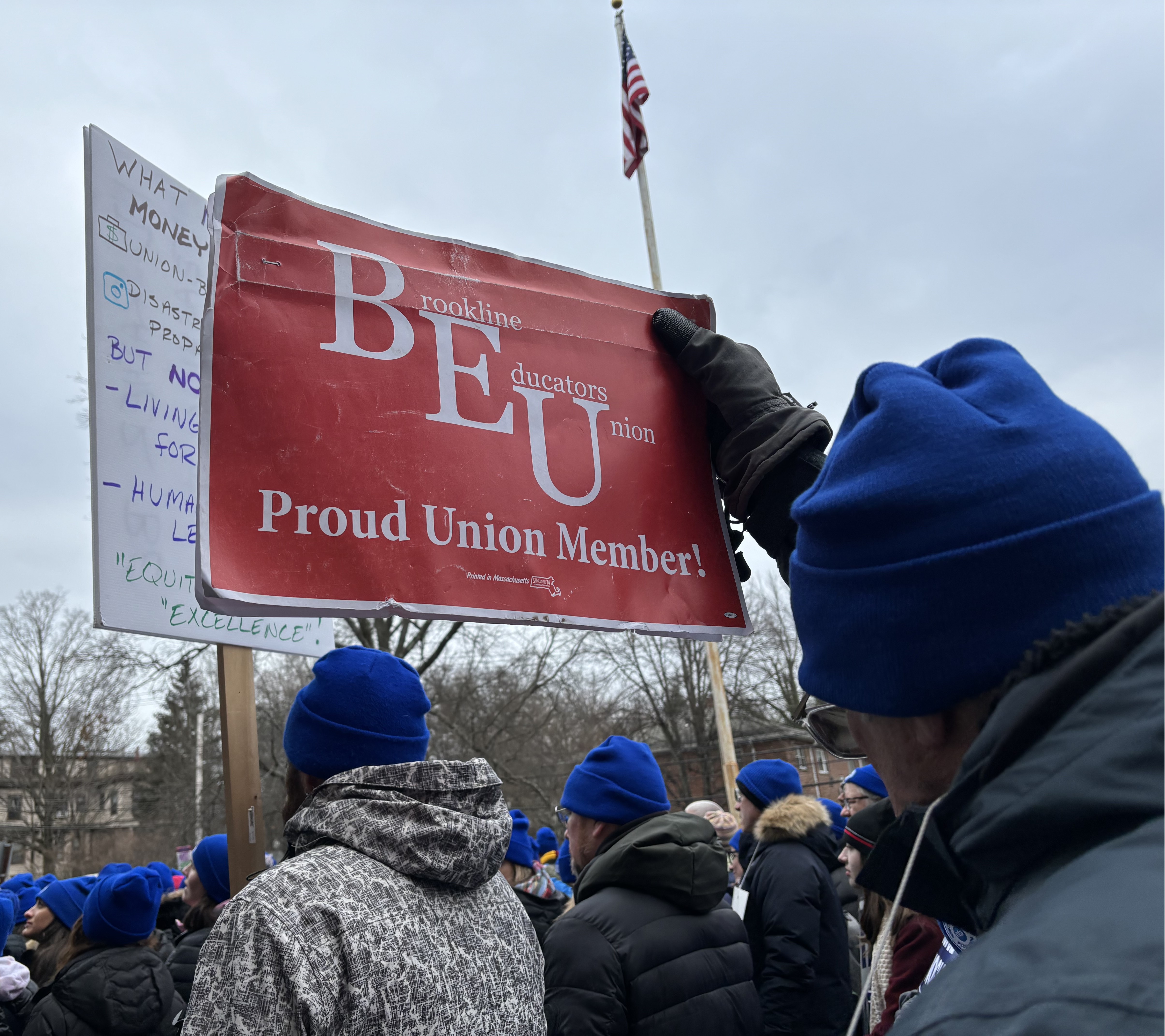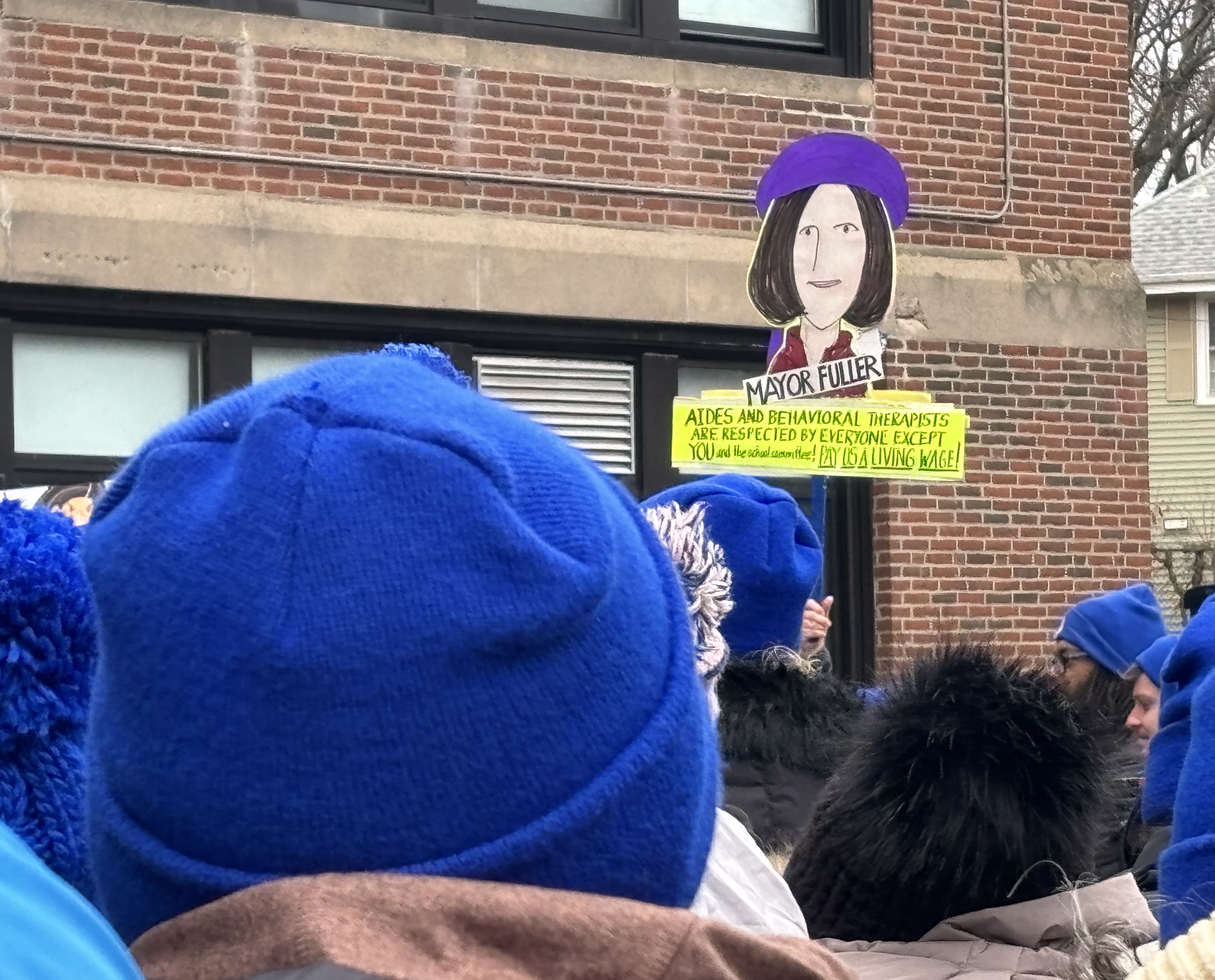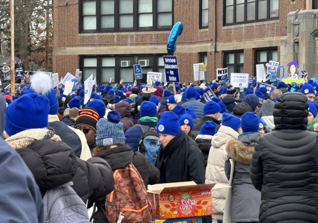 Defying freezing temperatures, hundreds of teachers — most wearing NTA blue hats — covered the front lawn of the Education Center at 100 Walnut Street and spilled onto the sidewalk in front of the building. Applauding and cheering the speakers, they frequently chanted “Pay Unit C,” beat drums and tambourines, blew whistles, and shook hand bells. Many carried hand-made signs supporting teachers and criticizing the Mayor and School Committee. Several blue, C-shaped, helium-filled balloons floated over the heads of the crowd. (See NewTV video.)