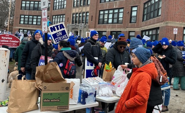 National Education Association President Becky Pringle echoed messages from Massachusetts Teachers Association leaders that the striking Newton teachers were fighting a larger fight for education. The NEA – the nation’s largest labor union – joined other unions, including The Teamsters and AFL-CIO — in endorsing the Newton Teachers Association (NTA) strike for a range of contractual issues. Today’s rally highlighted the NTA’s demands for higher salaries and greater support for teachers designated as Unit C in the NTA contract – i.e., those who work with students with special needs. The NTA is also calling for more social workers and psychologists to deal with students’ mental health issues. One speaker drew cheers when she described Unit C educators as “your children’s access to education.”