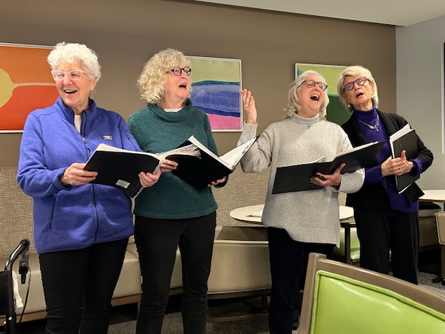 From left, JourneySongs singers Roberta Rosenberg, Chris Kyle, Lorel Zar-Kessler, and Jan Surrey recently performed at Adelaide of Newton Centre. The hospice choir sings at the assisted living facility every month. (Courtesy photo)