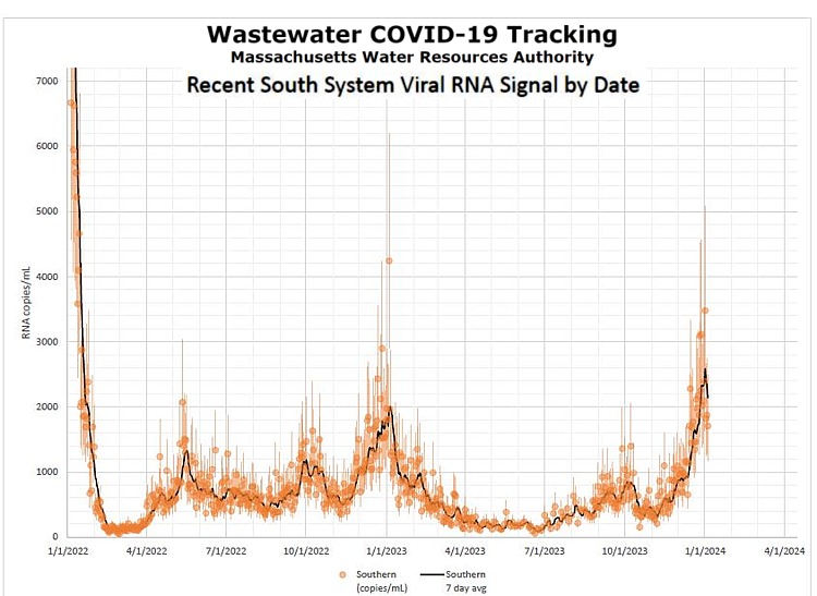 In the absence of widespread testing and reporting, measurement of COVID-19 in MWRA wastewater is considered the best method for assessing COVID-19 levels. The moving averages of measurements have now reached levels that were exceeded only during the Omicron variant wave of January 2022, although the most recent data may point to the beginning of a reversal in the trend.