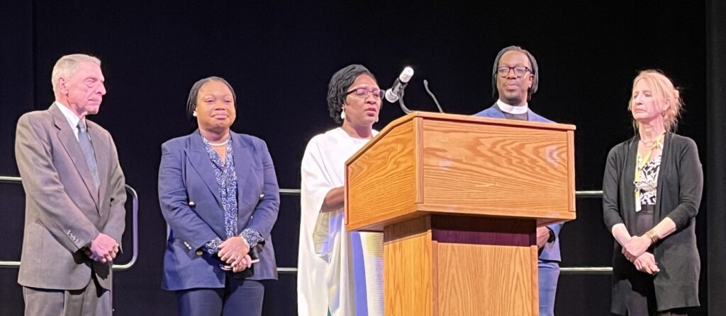 In between speakers, the all-student Newton All City Troubadours performed a few tunes. One of the chorus’ leaders, Newton Public Schools music teacher Eric Ritter, took a moment to make a pitch to the audience – which included Mayor Fuller and members of the City Council and School Committee – about the stalled teacher contract negotiations. He said he hoped the City will provide more resources for the schools.
