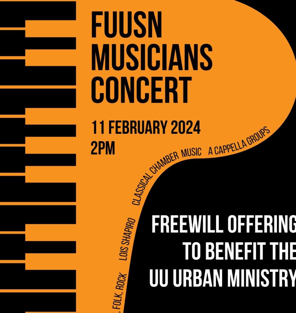 Come and hear the wonderful musicians of the First Unitarian Universalist Society in concert on Sunday, February 11 at 2PM in the FUUSN Sanctuary (1326 Washington Street, West Newton). This year’s concert is a fundraiser for the UU Urban Ministry. Musicians include renowned pianist Lois Shapiro, Paul Antonucci and Debra Minard, and…