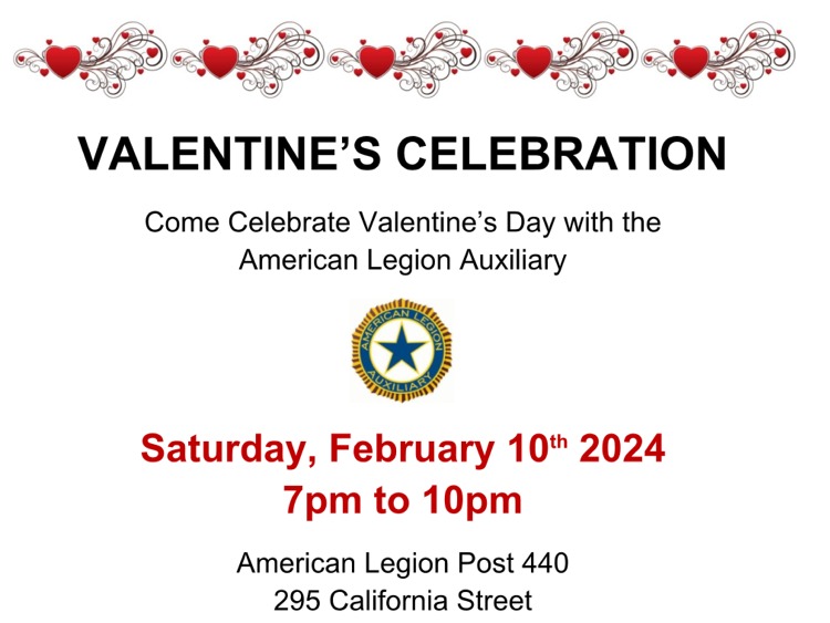 The American Legion Auxiliary will host a Valentine’s Day Celebration on Saturday, February 10, 7PM-10PM at American Legion Post 440 (295 California Street, Nonantum). Suggested donation of $15 at the door helps fund veterans’ programs. Buffet of sandwiches, pizza, and goodies. Music and trivia provided by DJ Mike Callahan (Oldies…