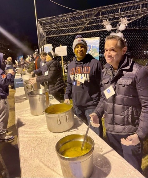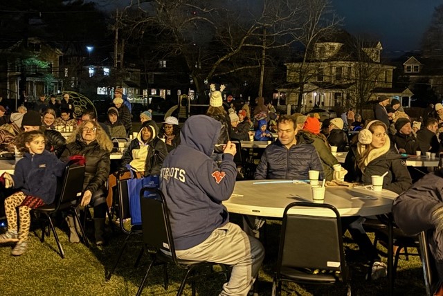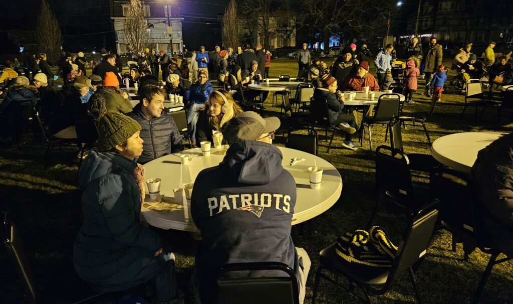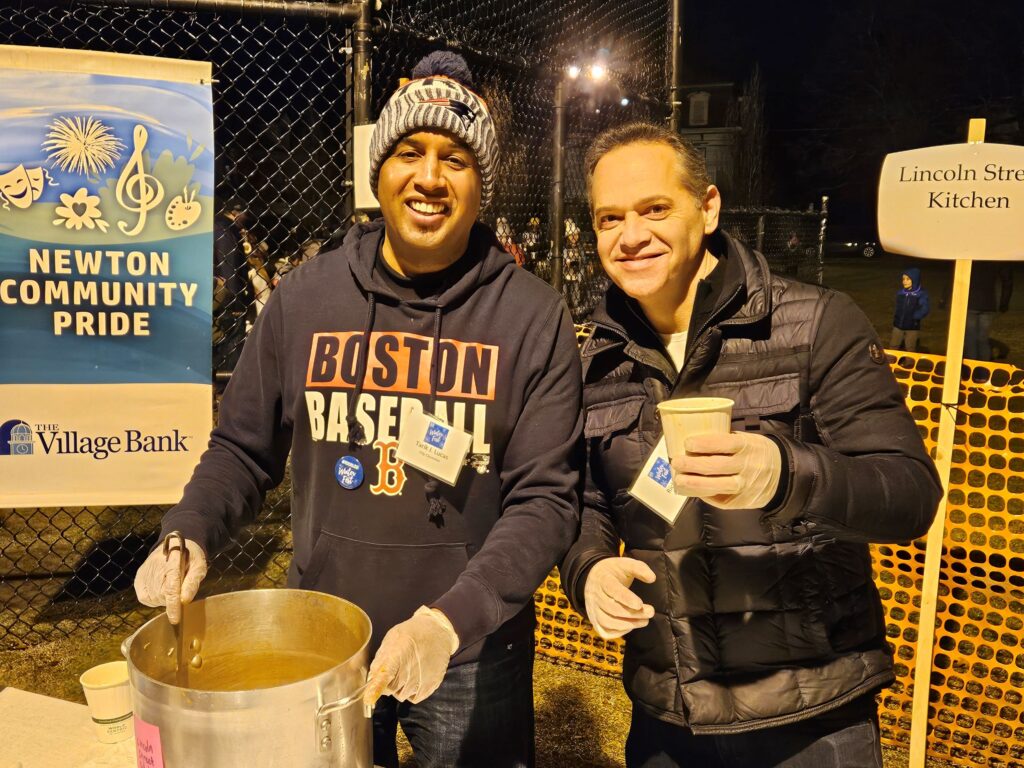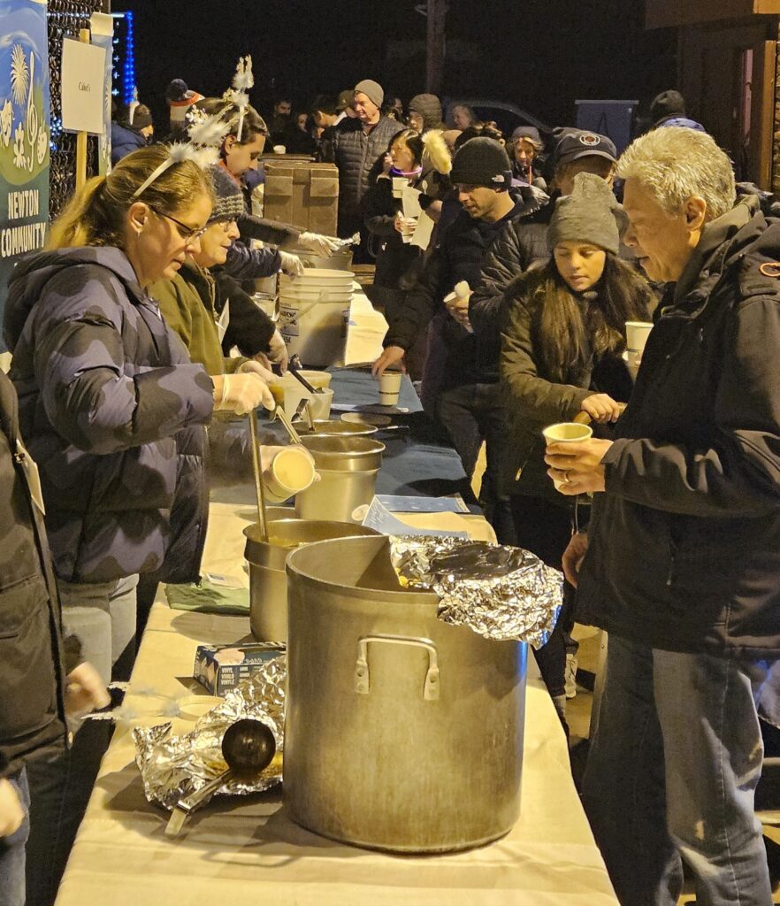 Remarkably, since his decision to take the festivities outside, former Newton City Councilor and longtime director of the Hyde Community Center John Rice has defied seasonal odds with three years of starlit, snow-free, moderate January Saturday nights. Newton Community Pride Executive Director Blair Lesser Sullivan explained that in the wake of Covid, the Board (of which John Rice is a member) was looking for a safe way to bring people together, and knew that there were other communities with outdoor winter events. Merging the Soup Social with WinterFEST is the result. “People were skeptical about taking the Soup Social out of doors, but it has been a great success,” Mr. Rice said. On Monday, Mr. Rice reported that there were no leftovers — no soup, no rolls, no hot chocolate, nor ice cream.