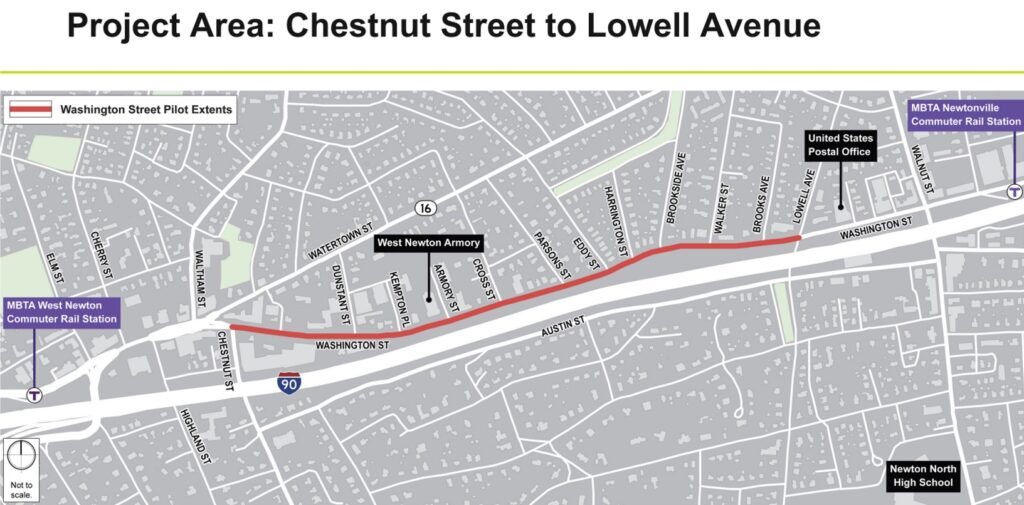 On Wednesday, January 17, Josh Ostroff, outgoing Director of Newton’s Transportation Planning Department, presented a proposal before the Public Facilities Committee to allow reconfiguration of Washington Street from Lowell Avenue to Chestnut Street to make it “safer, more welcoming and enjoyable” for residents and businesses.