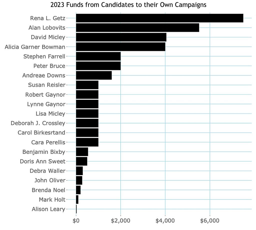 Rena Getz loaned $8,000 to her campaign, while Alan Lobovits contributed $1,560 and loaned $5,000 to his campaign. David Micley contributed $1050 and loaned $3000 to his campaign, while his mother added a $1,000 contribution.