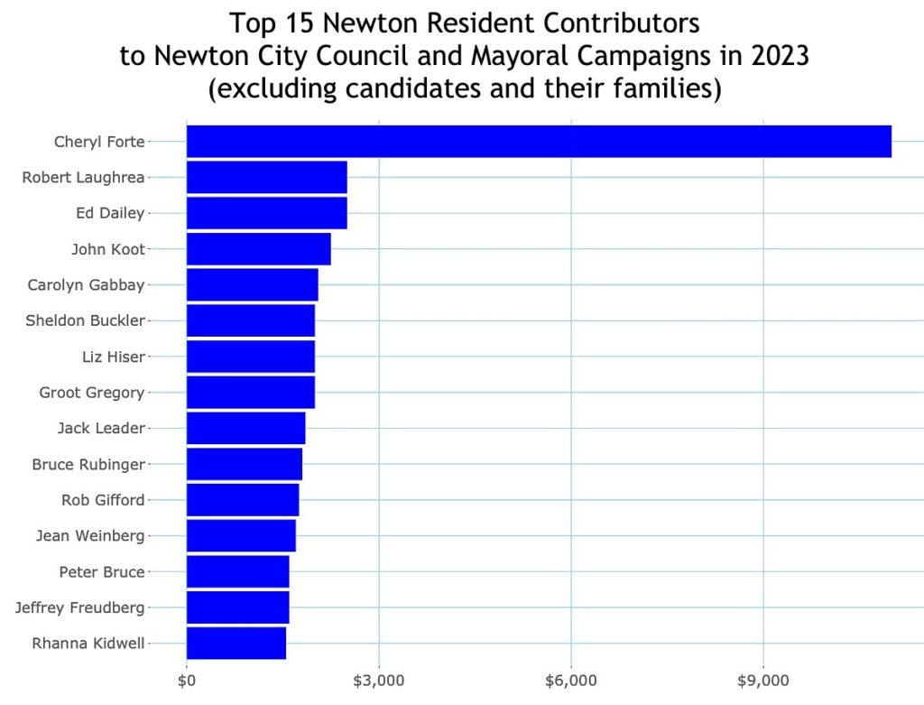 While Newton is a city of 59,654 voters, over 20% of the $186,982 in Newton resident contributions (excluding candidates and their families) came from 15 individuals.
