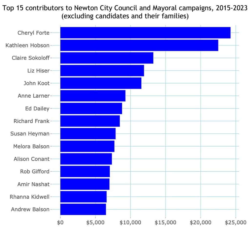 Top 15 Newton resident contributors to Newton City Council and Mayoral campaigns in 2023, excluding candidates/family (data: ocpf.us)