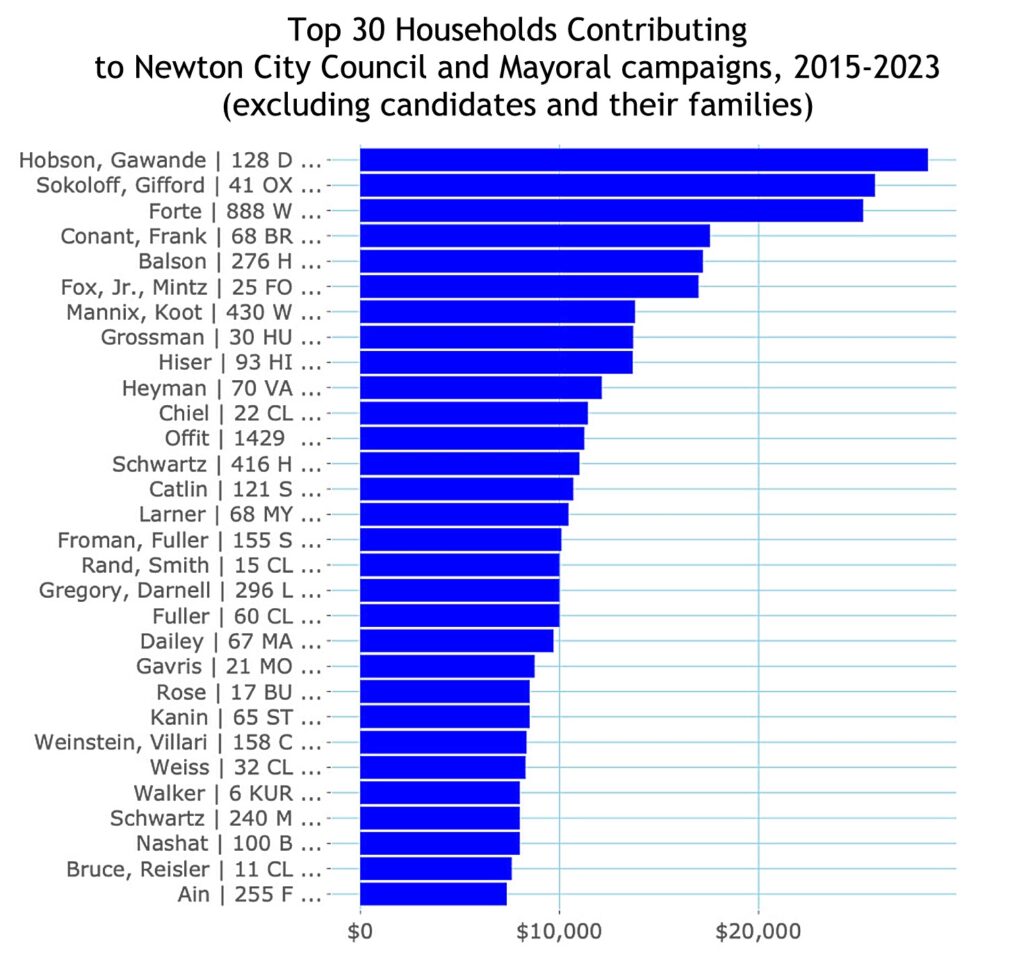 Top 30 households contributing to Newton City Council and Mayoral campaigns, 2015-2023. (data: ocpf.us)