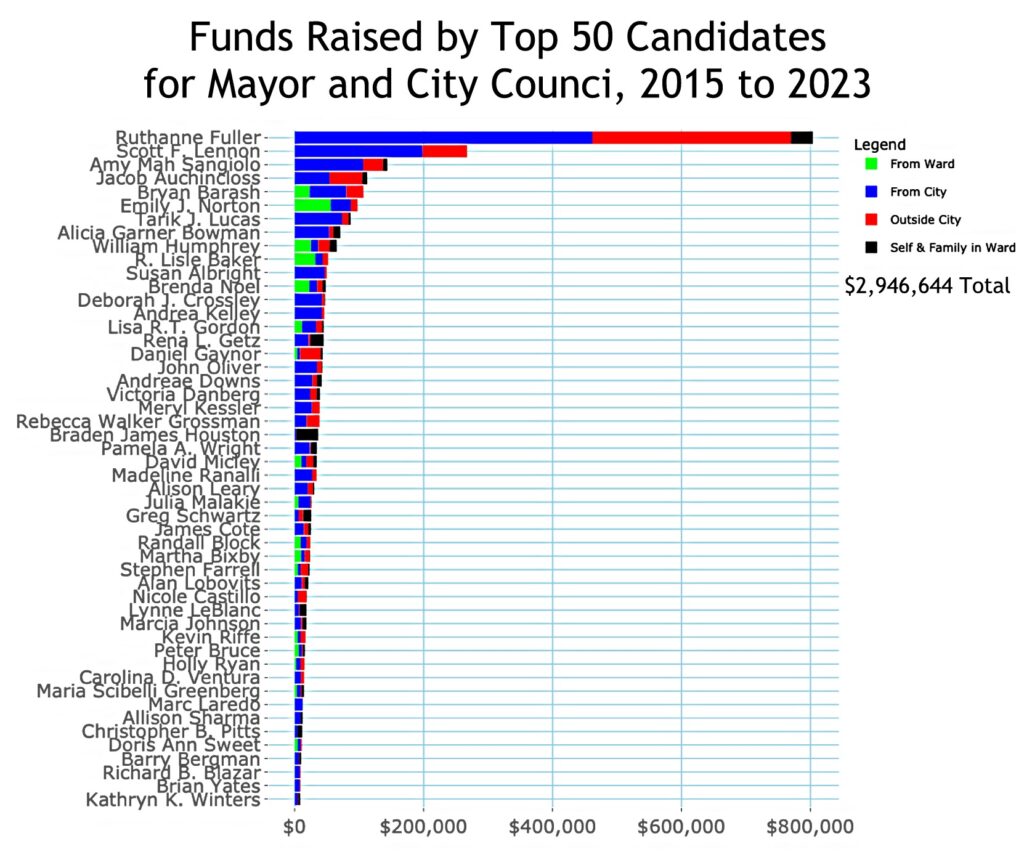 Funds raised by top 50 candidates for Mayor and City Council, 2015-2023. (data: ocpf.us)