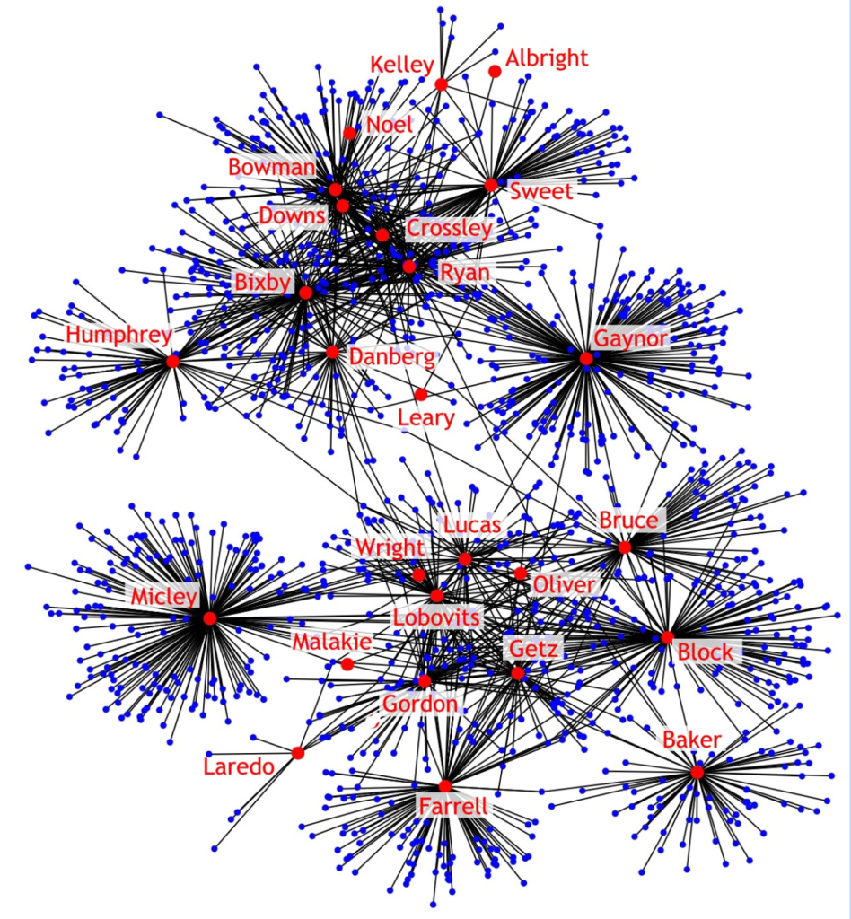 Mapping of donors (blue) to candidates (red) for Newton 2023 City Council donations.