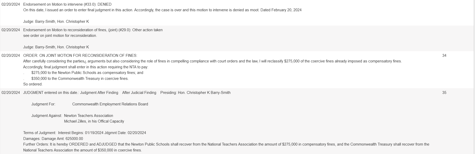 On February 20, Middlesex County Superior Court announced several rulings that closed the filings and motions made during the Teachers Strike. Of the $625,000 in total fines accrued by the NTA during the strike, the court elected to divert $275,000 to be payable to Newton Public Schools, with the remaining $350,000 due to the Commonwealth of Massachusetts.