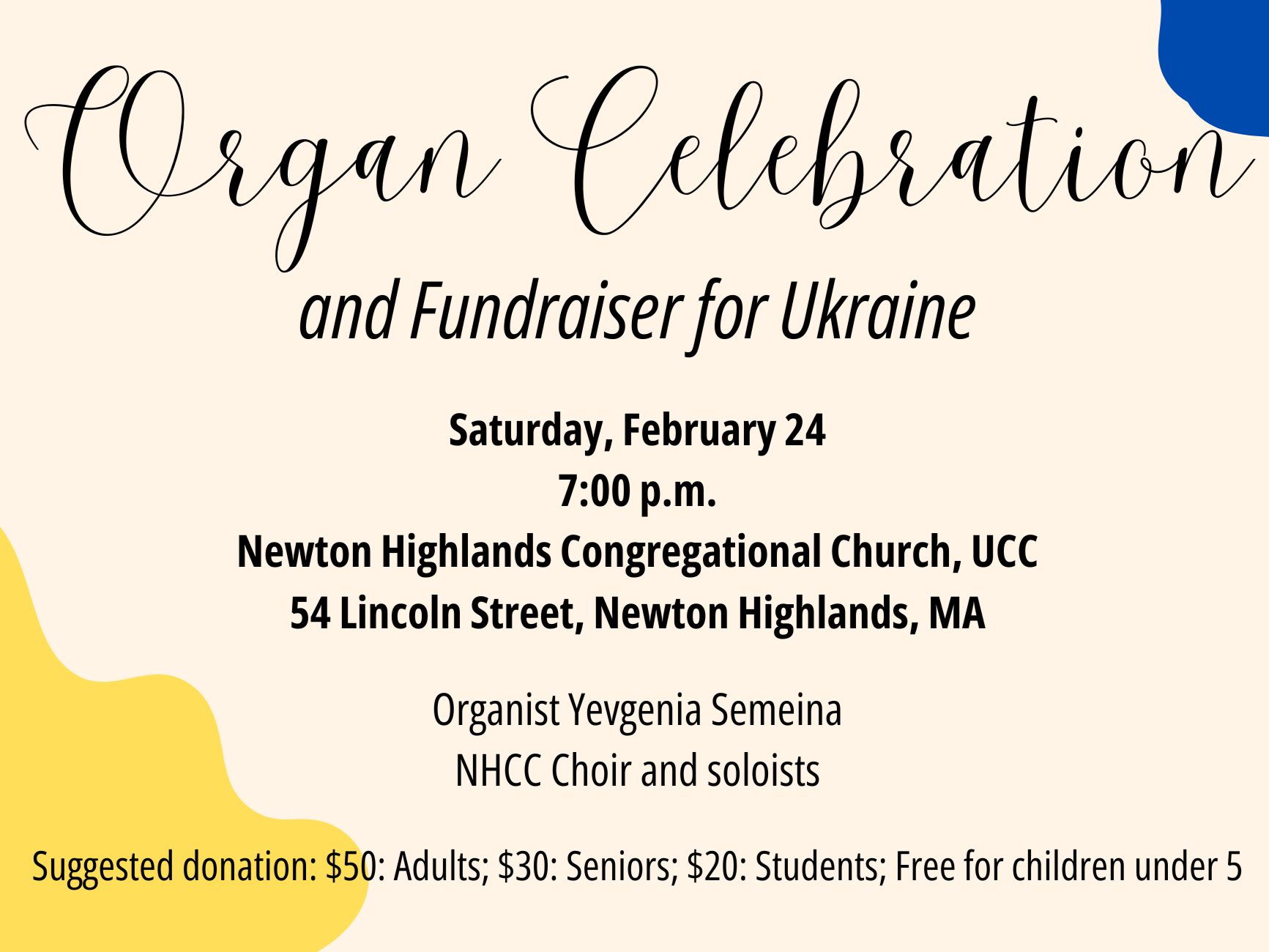 Newton Highlands Congregational Church (NHCC) is hosting an Organ Celebration featuring organist Yevgenia Semeina, the NHCC Choir, and the NHCC soloists on February 24, 7PM at the Newton Highlands Congregational Church (54 Lincoln St, Newton Highlands). It is free and open to the public, and there is a $50 suggested donation, to benefit Ukraine.